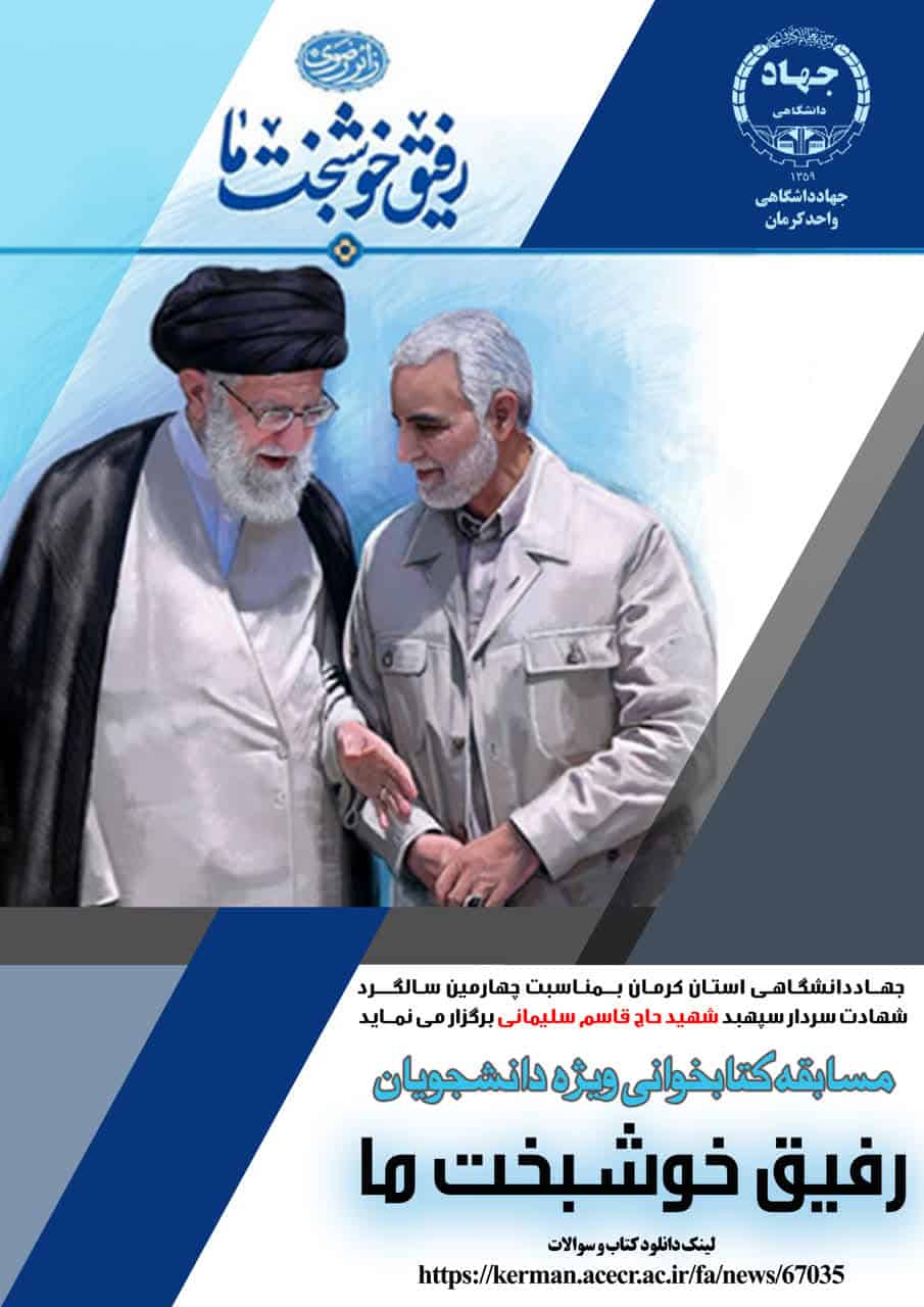 به مناسبت چهارمین سالگرد شهادت سپهبد شهید حاج قاسم سلیمانی مسابقه کتابخوانی از کتاب رفیق خوشبخت ما برگزار می شود.