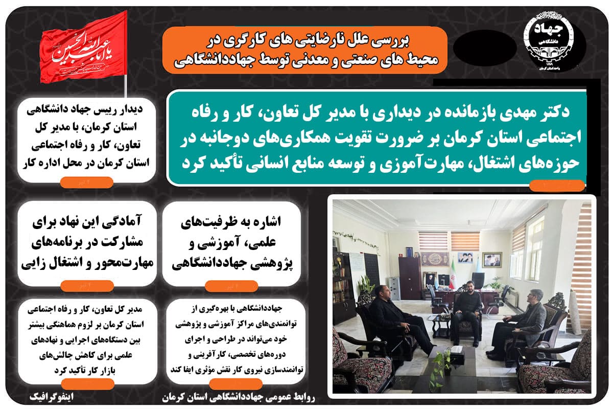 رییس جهاددانشگاهی استان کرمان، در دیداری با مدیر کل تعاون، کار و رفاه اجتماعی استان کرمان بر ضرورت تقویت همکاریهای دوجانبه در حوزههای اشتغال، مهارتآموزی و توسعه منابع انسانی تأکید کرد.