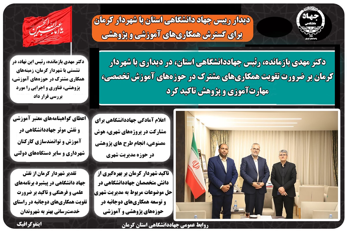 به گزارش روابط عمومی جهاددانشگاهی استان کرمان، دکتر مهدی بازمانده، رئیس این نهاد، در نشستی با شهردار کرمان، زمینههای همکاری مشترک در حوزههای آموزشی، پژوهشی، فناوری و اجرایی را مورد بررسی قرار داد.